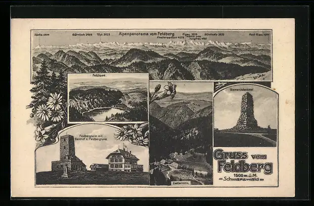 AK Feldberg / Schwarzwald, Feldsee, Zastlerhütte, Feldbergturm mit Gasthof z Feldbergturm, Alpenpanorama vom Feldberg