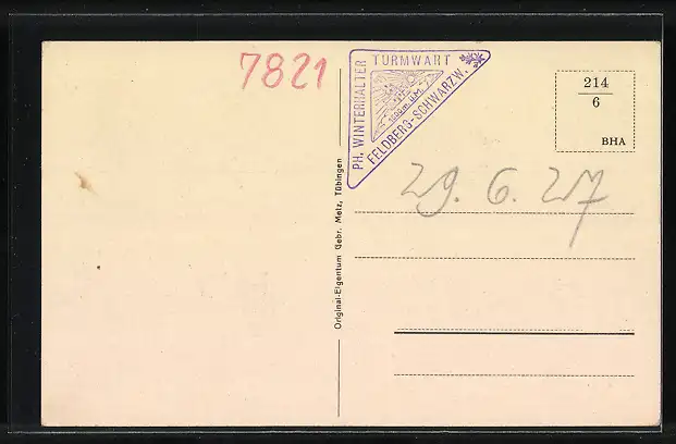 Personenbezogene Daten auf der Rückseite der Karte wurden durch blauen Textmarker unkenntlich gemacht. Die blauen Stellen sind auf die Vorderseite durchgeweicht und wirken sich negativ auf das Postkartenfoto aus