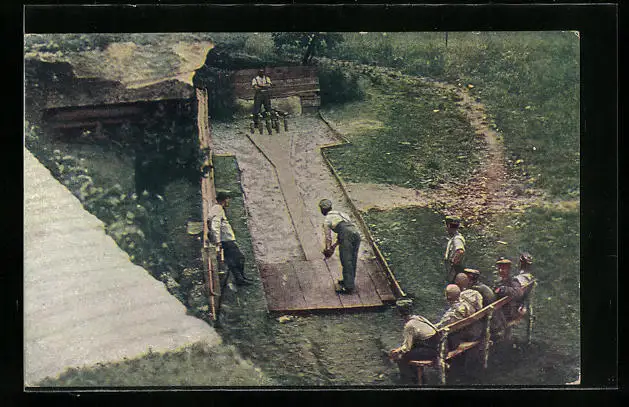 AK Feldgraue beim Kegelspiel auf selbst hergestellter Kegelbahn