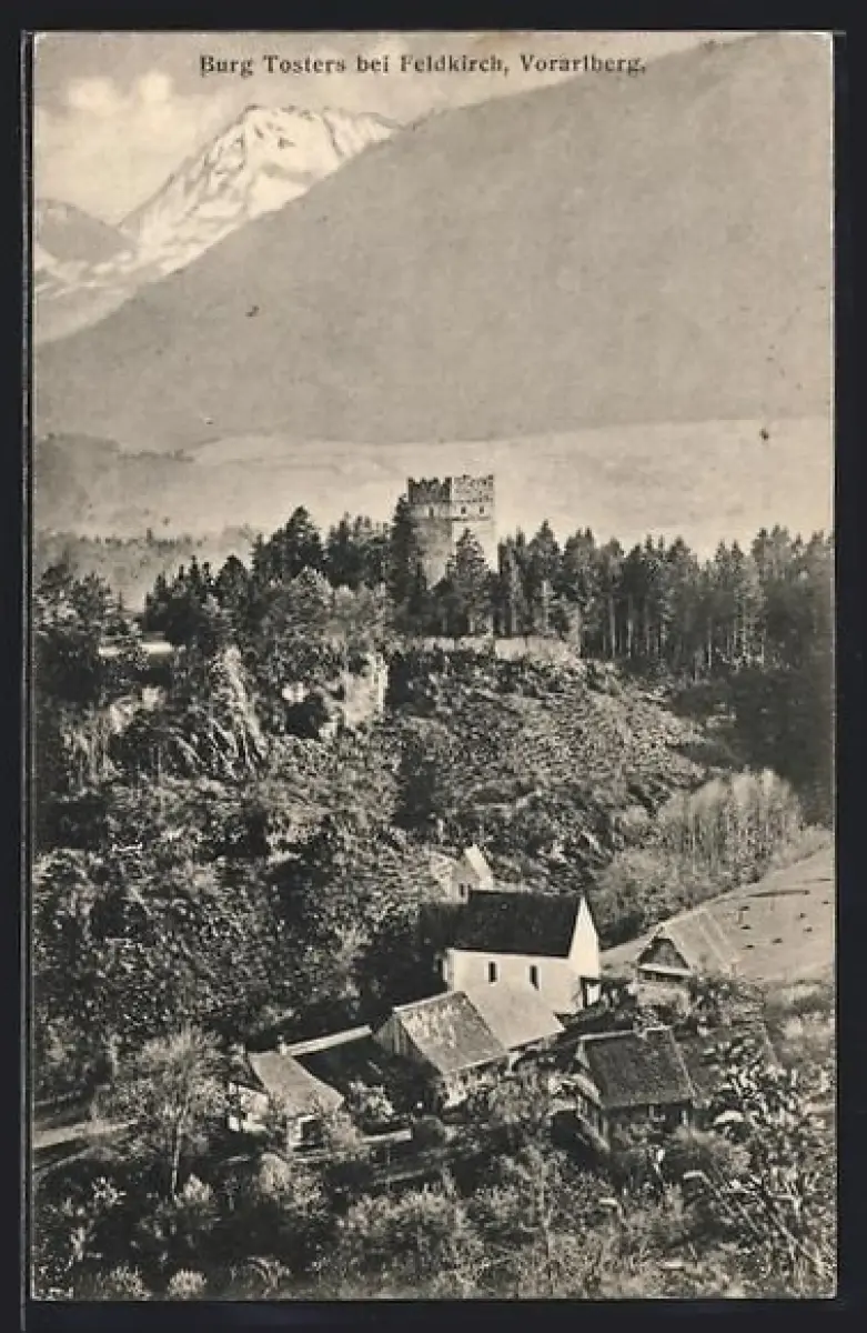 AK Feldkirch, Blick zur Burg Tosters mit Alpenpanorama