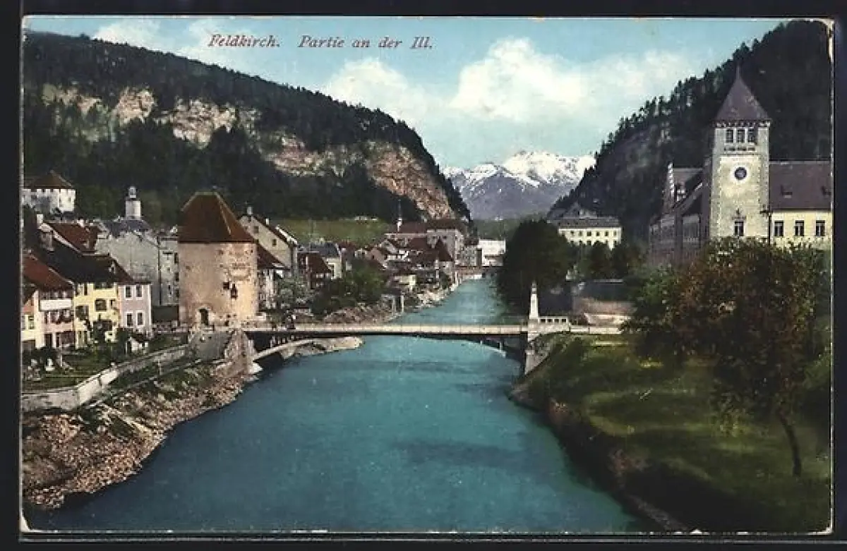 AK Feldkirch, Partie an der Ill mit Blick auf Brücke