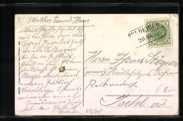 Personenbezogene Daten auf der Rückseite der Karte wurden durch blauen Textmarker unkenntlich gemacht. Die blauen Stellen sind auf die Vorderseite durchgeweicht und wirken sich negativ auf das Postkartenfoto aus