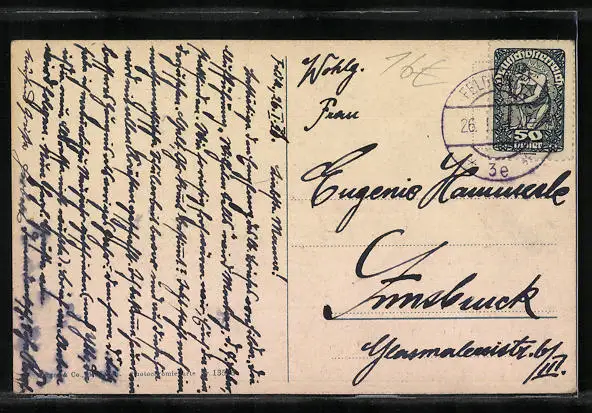 Personenbezogene Daten auf der Rückseite der Karte wurden durch blauen Textmarker unkenntlich gemacht. Die blauen Stellen sind auf die Vorderseite durchgeweicht und wirken sich negativ auf das Postkartenfoto aus
