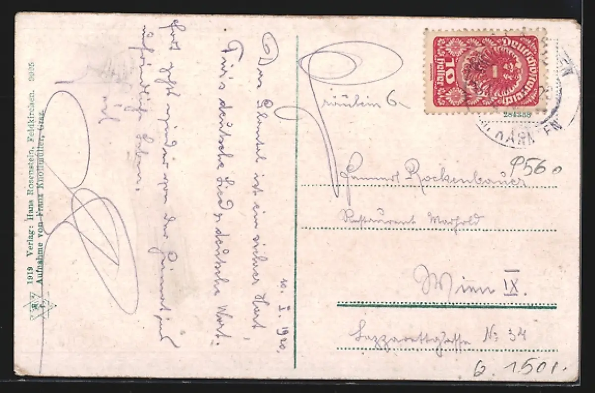Personenbezogene Daten auf der Rückseite der Karte wurden durch blauen Textmarker unkenntlich gemacht. Die blauen Stellen sind auf die Vorderseite durchgeweicht und wirken sich negativ auf das Postkartenfoto aus