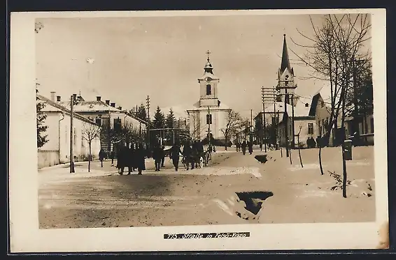 AK Felsö-Visso, Strasse im Ortskern mit Kirchen, winterliche Ansicht