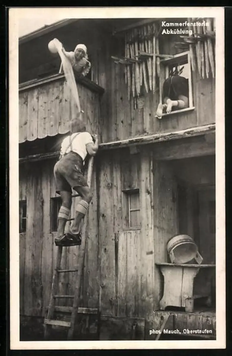 AK Fensterlnde Burschen bekommen einen abkühlenden Guss aus dem Nachttopf