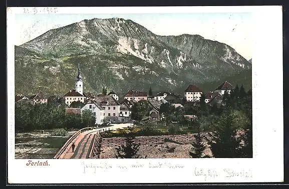 AK Ferlach, Ortsansicht mit Strassenbrücke und Bergpanorama, Mauer