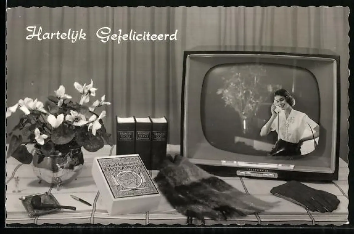 AK Fernseher von Telefunken auf dem Tisch neben Lexikon, Pfeife und Blumen