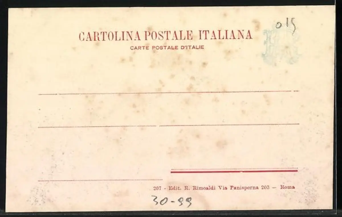 Personenbezogene Daten auf der Rückseite der Karte wurden durch blauen Textmarker unkenntlich gemacht. Die blauen Stellen sind auf die Vorderseite durchgeweicht und wirken sich negativ auf das Postkartenfoto aus