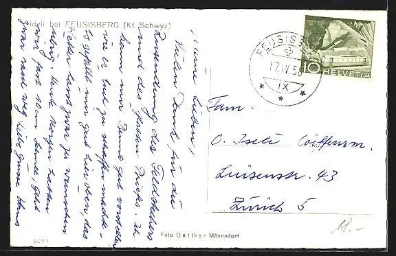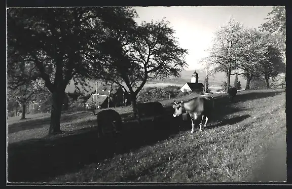 AK Feusisberg, Ortspartie mit weidender Kuh