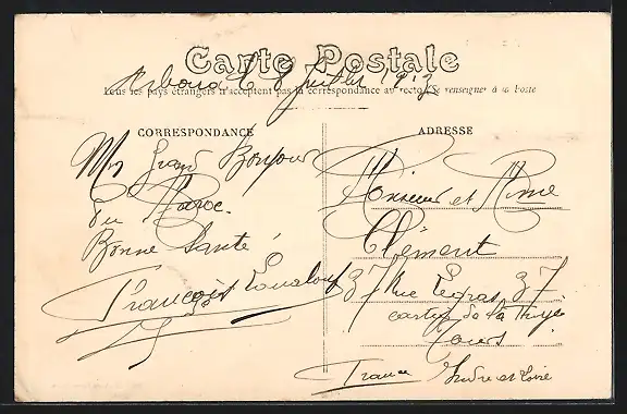 Personenbezogene Daten auf der Rückseite der Karte wurden durch blauen Textmarker unkenntlich gemacht. Die blauen Stellen sind auf die Vorderseite durchgeweicht und wirken sich negativ auf das Postkartenfoto aus
