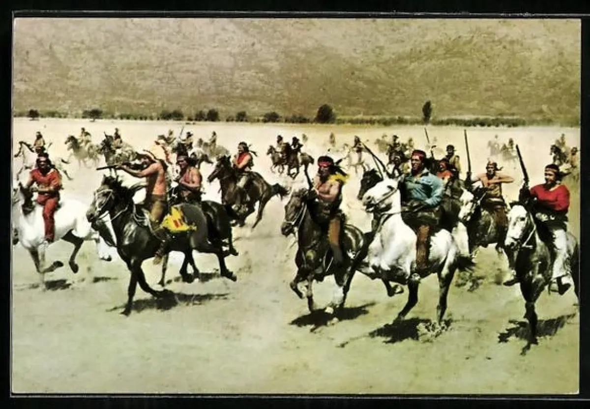 AK Filmszene aus Buffalo Bill, die Rothäute reiten über die Prärie