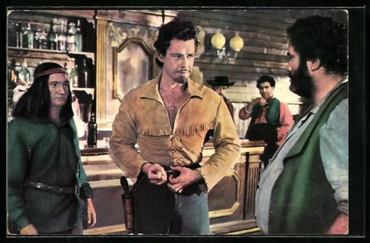 AK Filmszene aus Das war Buffalo Bill, Schauspieler Gordon Scott im Kostüm als Buffalo Bill
