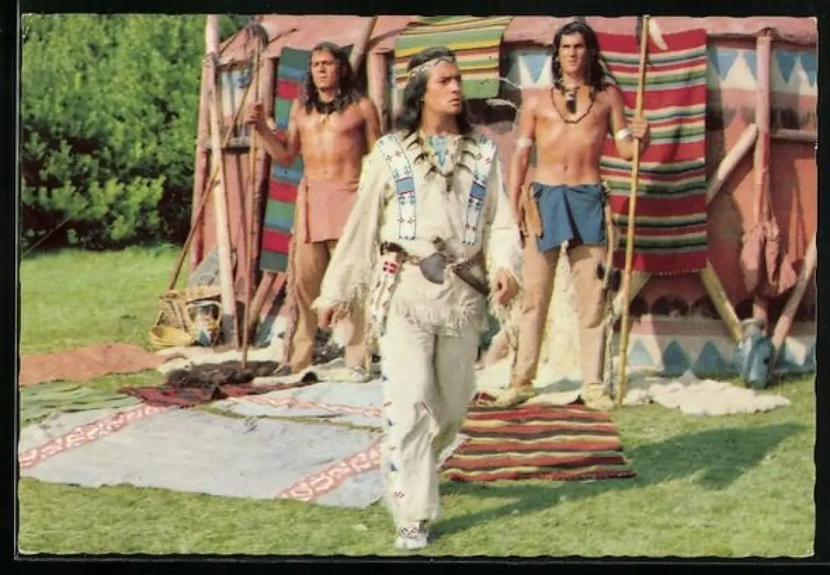 AK Filmszene aus Karl May-Film Unter Geiern, Winnetou aus dem Häuptlingszelt kommend