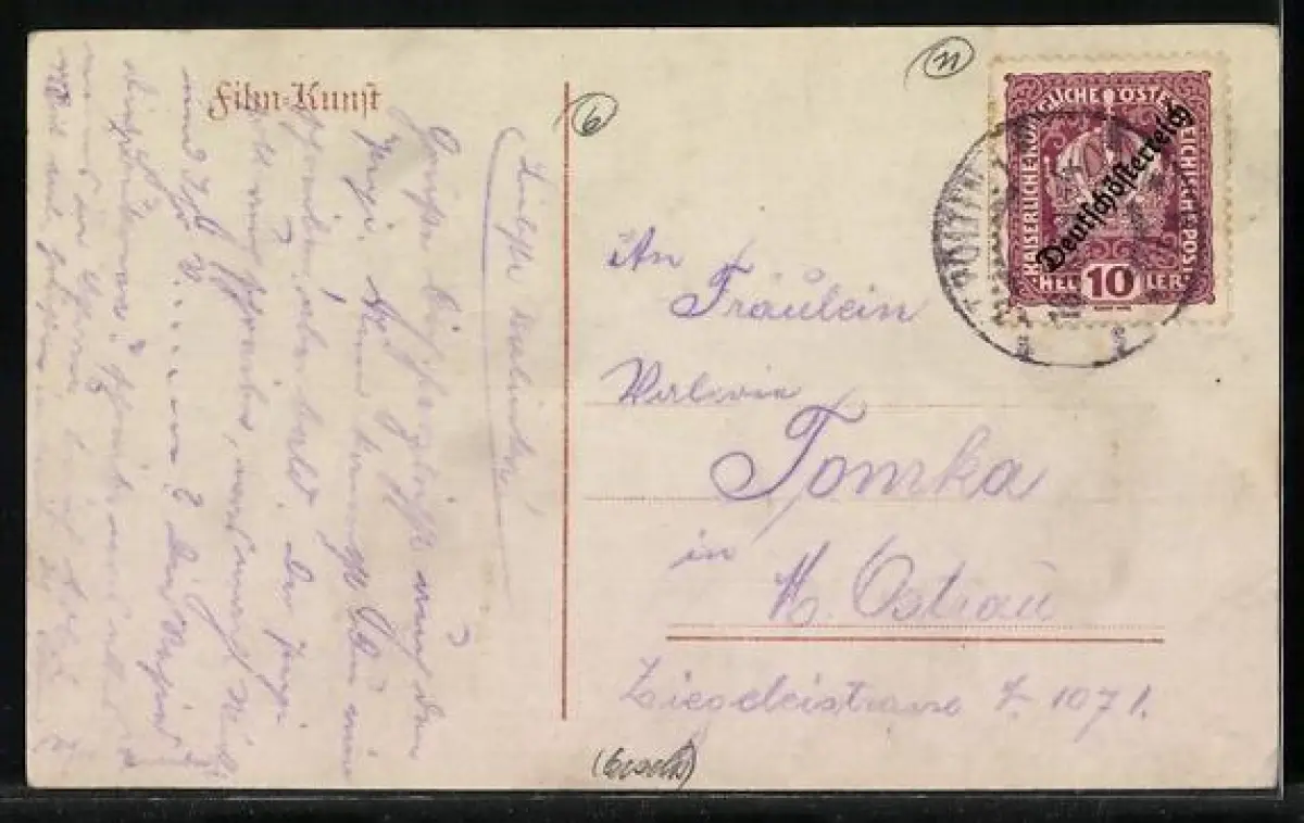 Personenbezogene Daten auf der Rückseite der Karte wurden durch blauen Textmarker unkenntlich gemacht. Die blauen Stellen sind auf die Vorderseite durchgeweicht und wirken sich negativ auf das Postkartenfoto aus