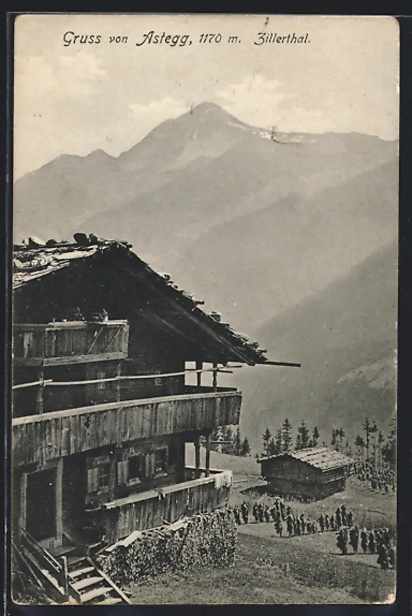 AK Finkenberg /Zillerthal, Gasthaus Astegg mit Versammlung
