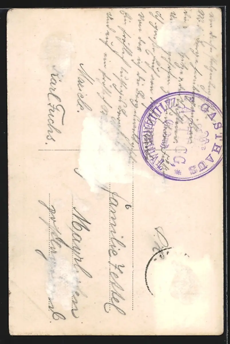 alte Ansichtskarte, gelaufen, Briefmarke entfernt, rückseitig Oberflächenschaden, rückseitig Klebe- und Papierreste, guter Zustand
