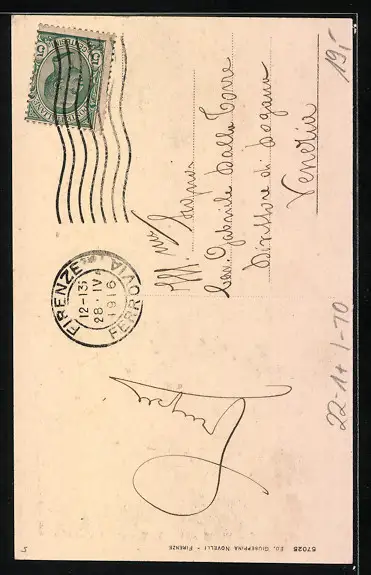Personenbezogene Daten auf der Rückseite der Karte wurden durch blauen Textmarker unkenntlich gemacht. Die blauen Stellen sind auf die Vorderseite durchgeweicht und wirken sich negativ auf das Postkartenfoto aus