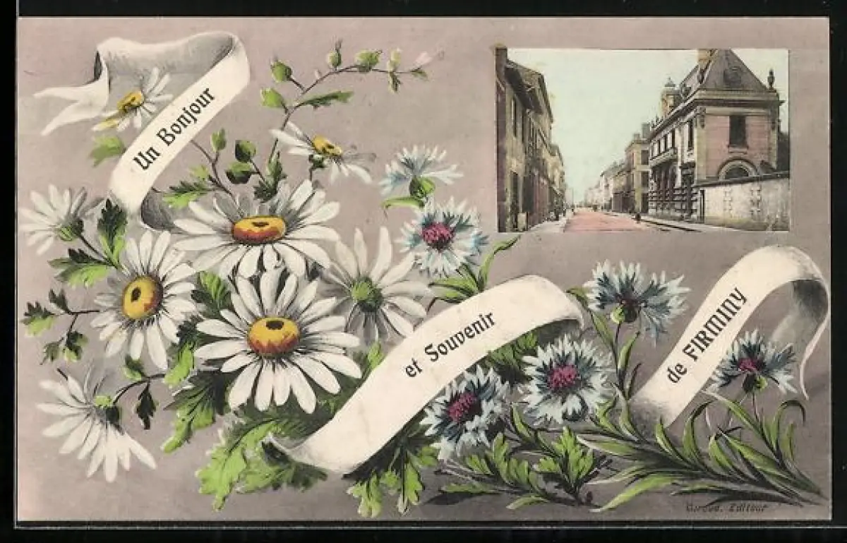 AK Firminy, Un Bonjour et Souvenir de Firminy avec fleurs et vue de la rue principale