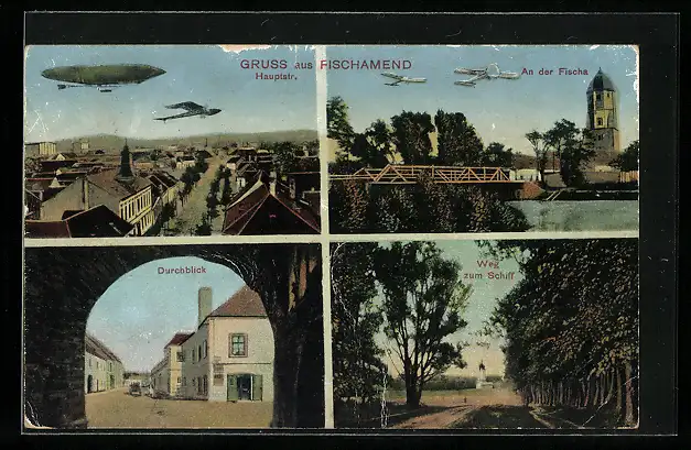 AK Fischamend, Zeppelin und Flugzeug über der Hauptstrasse, Weg zum Schiff