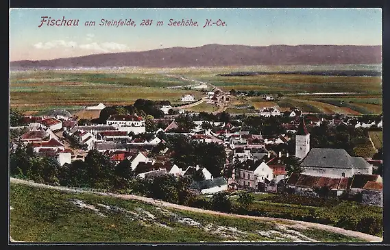 AK Fischau am Steinfelde, Ortsansicht mit Berglandschaft