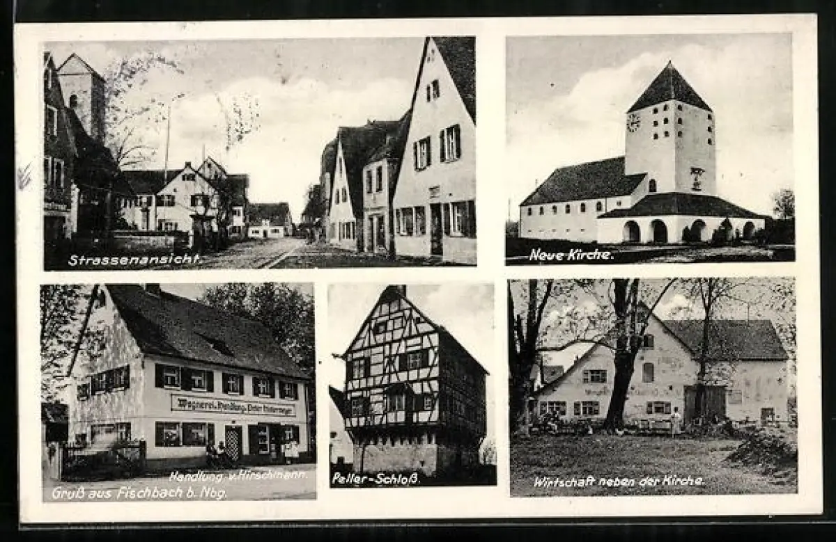 AK Fischbach b. Nbg., Handlung von Hirschmann, Peller-Schloss, Wirtschaft neben der Kirche, Neu Kirche