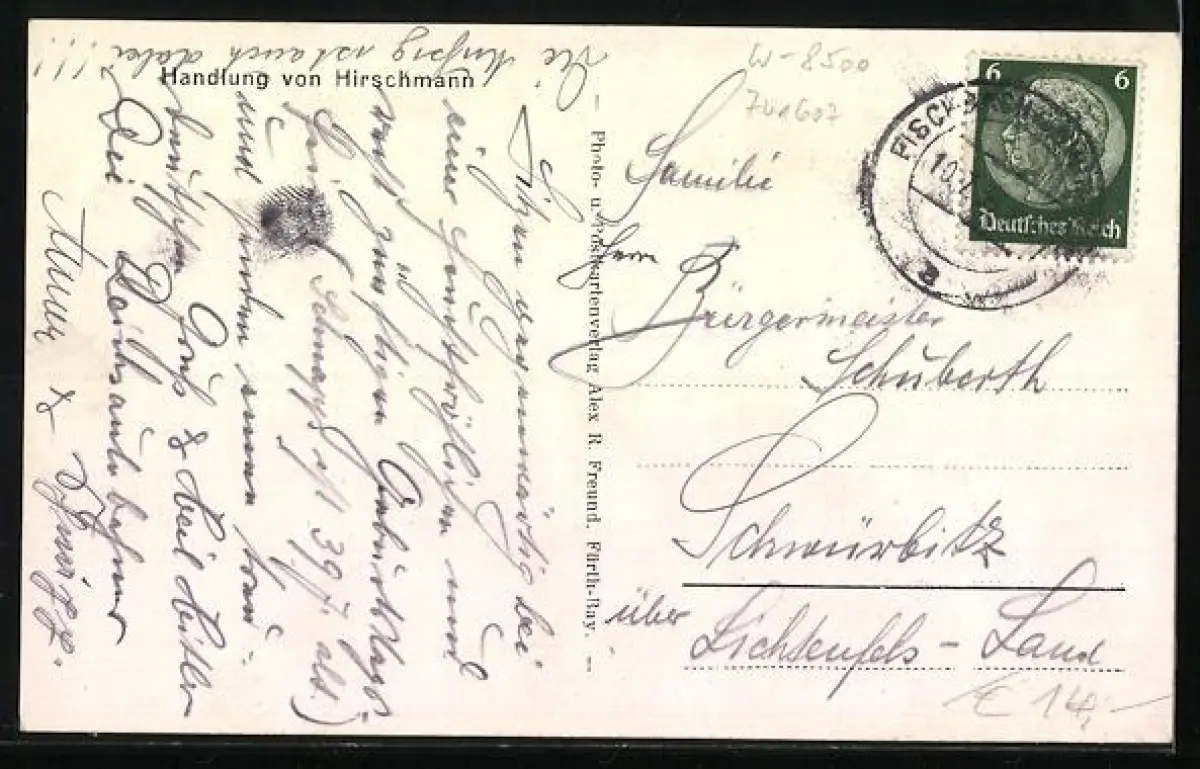 AK Fischbach b. Nbg., Handlung von Hirschmann, Peller-Schloss, Wirtschaft neben der Kirche, Neu Kirche