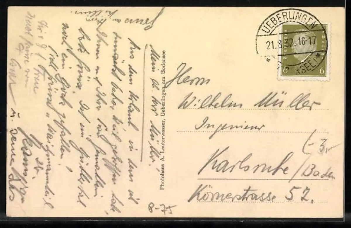 Personenbezogene Daten auf der Rückseite der Karte wurden durch blauen Textmarker unkenntlich gemacht. Die blauen Stellen sind auf die Vorderseite durchgeweicht und wirken sich negativ auf das Postkartenfoto aus