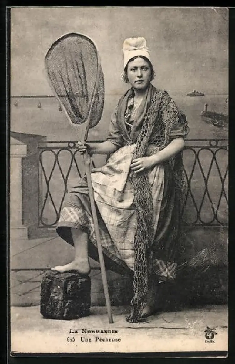 AK Fischerin mit Kescher und Netz, Le Normandie, Une Pêcheuse