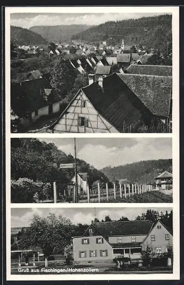 AK Fischingen /Hohenzollern, Gasthaus und Pension zum Bahnhof, Ortspartie mit Wegweiser nach Fischingen, Teilansicht
