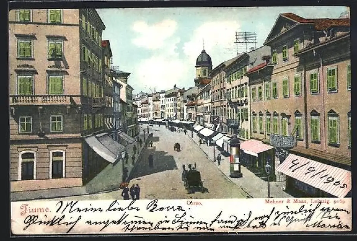 AK Fiume, Corso, Strassenpartie mit Geschäften aus der Vogelschau