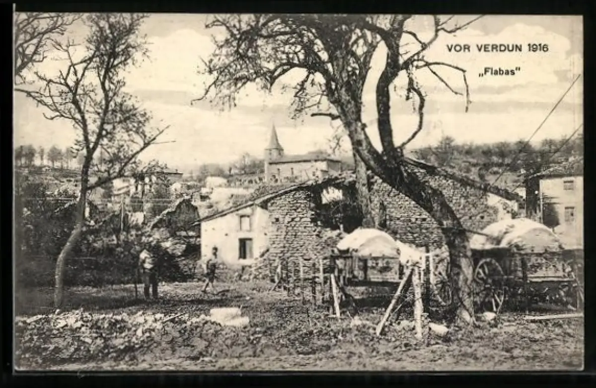 AK Flabas, Vue du village avec chariots et arbres en 1916