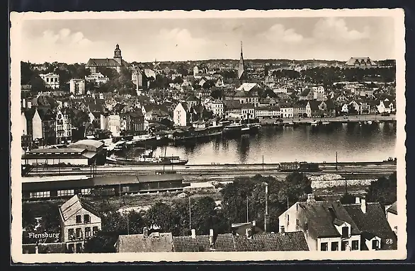 AK Flensburg, Ortsansicht mit Eisenbahn