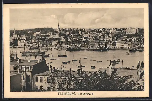AK Flensburg, Panorama mit Schiffen im Hafen