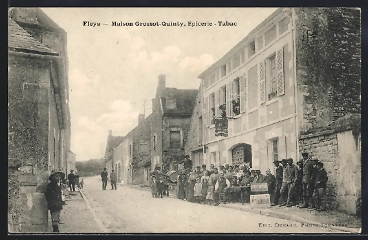 AK Fleys, Maison Grosset-Quinty, Épicerie, Tabac avec groupe de villageois devant le magasin