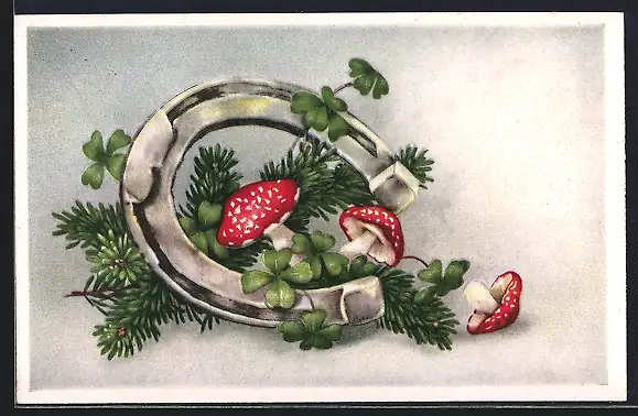 AK Fliegenpilze mit Kleeblättern in einem Hufeisen