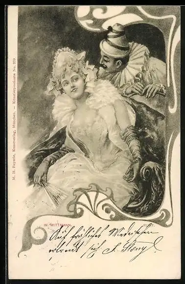 AK Flirt, verkleideter Mann bezirzt Fächer tragende Frau, Fasching