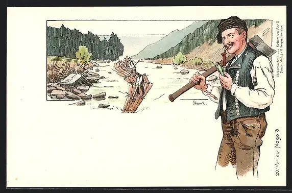 AK Flösser treiben das gefällte Holz den Fluss hinab