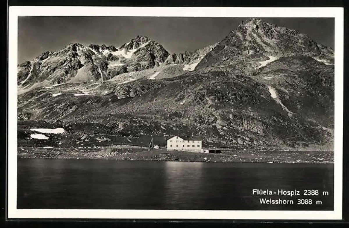 AK Flüela-Hospiz, Ansicht der Berghütte und Weisshorn