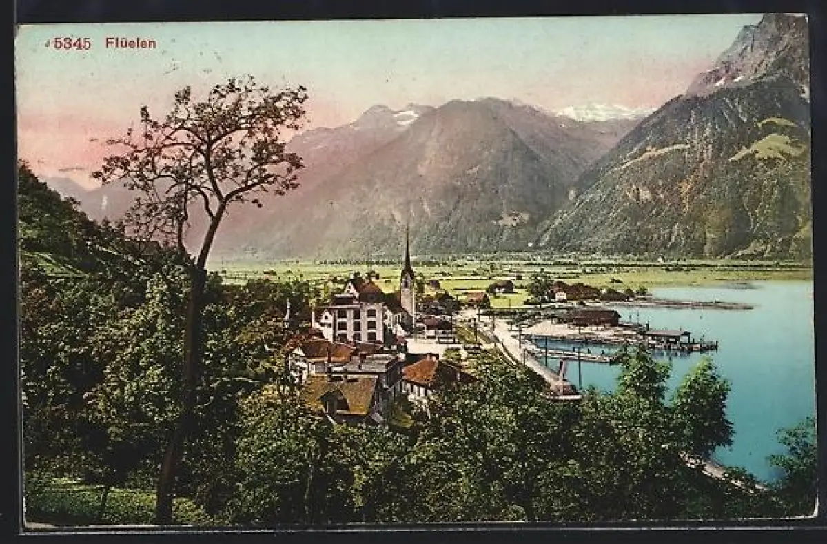 AK Flüelen, Totalansicht mit Uferpartie u. See