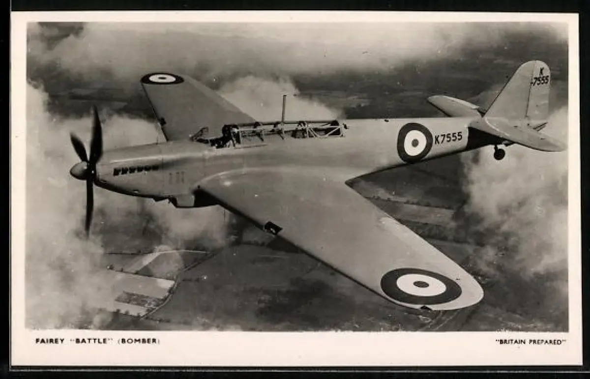 AK Flugzeug Fairey Battle Bomber über der Ortschaft