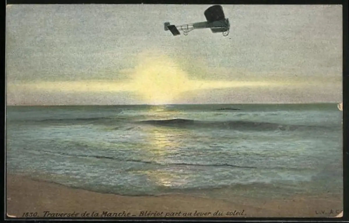 AK Flugzeug über dem Meer, Blériot part au lever du soleil