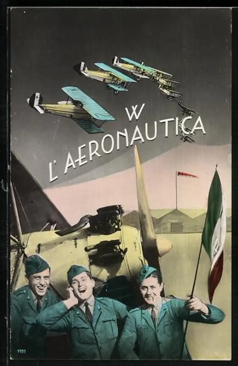 AK Flugzeuge in Formation, italienische Soldaten