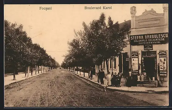 AK Focsani, Boulevard Karol mit Stefan Barbulescus Coloniale, Delicateste, Restaurant