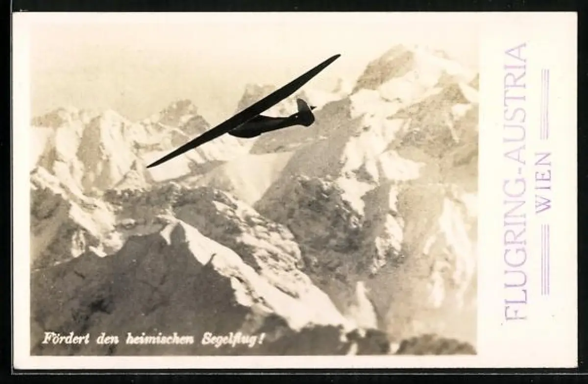 AK Fördert den heimischen Segelflug!, Segelflugzeug im verschneiten Gebirge