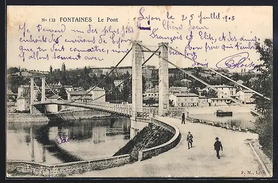 AK Fontaines, Le Pont sur la Saône avec passants et vue du village au fond