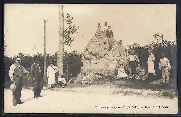 AK Fontenay-le-Vicomte, Roche d`Amour avec groupe de personnes posant autour du rocher