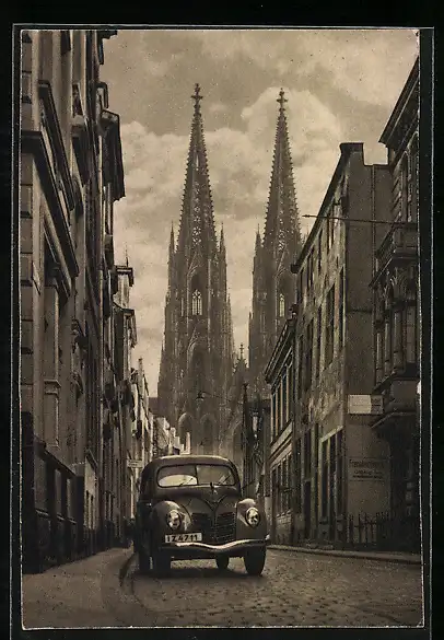AK Ford Taunus vor dem Kölner Dom, Kennzeichen IZ 4711, Reklame