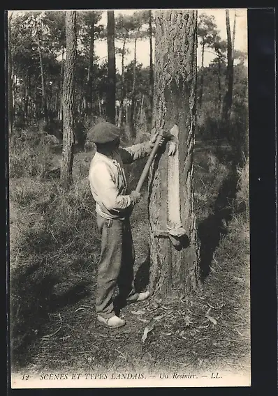 AK Forstarbeiter schneidet mit der Axt die Rinde des Baumes ab