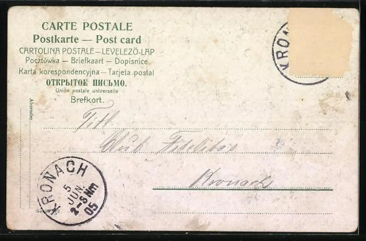 alte Ansichtskarte, gelaufen 1905, Briefmarke entfernt, rückseitig Oberflächenschaden, Bugspuren li. oben, guter Zustand